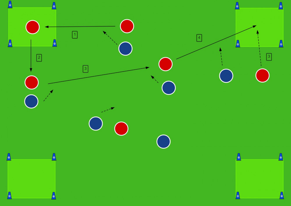 Dzielimy zawodników na dwie drużyny. Wymiary boiska 30m x 40 m na boisku ustawiamy 4 kwadraty ze stożków 5m x 5m w narożnikach pola gry. Za dystrybucje piłek odpowiada trener.